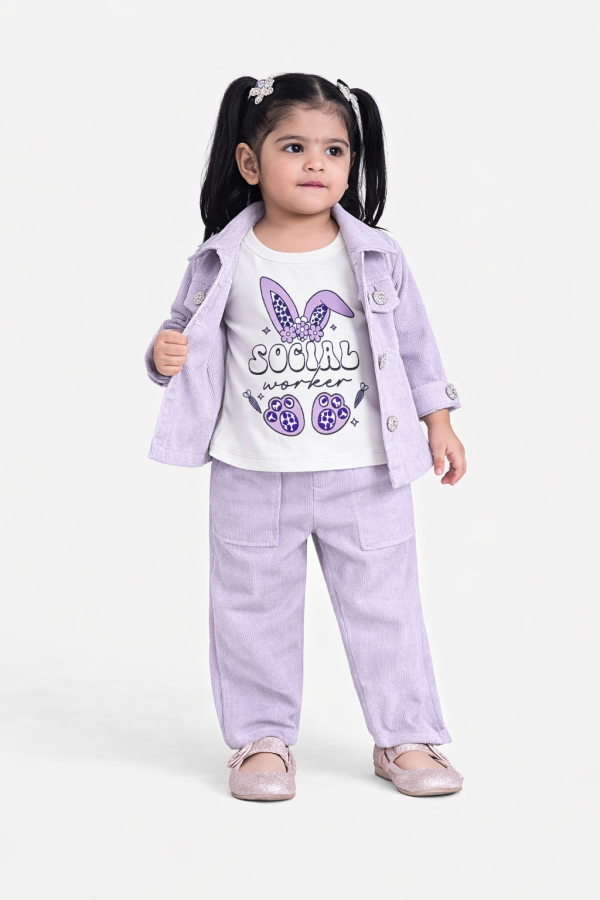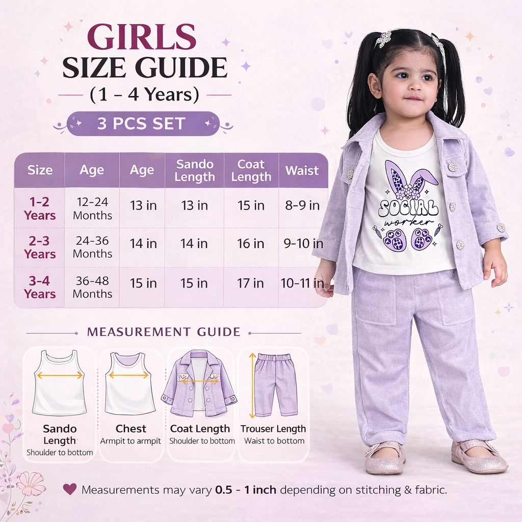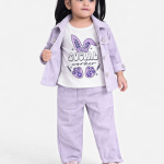 Trendy and comfortable girls 3 piece outfit featuring a stylish jacket, printed sando (sleeveless inner), and matching trousers. Designed for a modern casual look, this outfit is perfect for outings, casual wear, and everyday style. Suitable for girls aged 1 to 4 years.