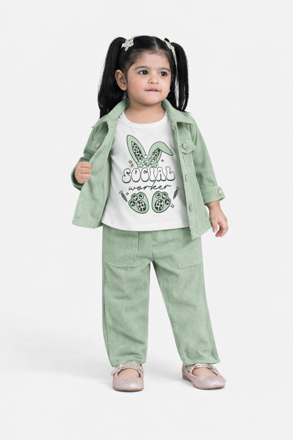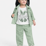 Trendy and comfortable girls 3 piece outfit featuring a stylish jacket, printed sando (sleeveless inner), and matching trousers. Designed for a modern casual look, this outfit is perfect for outings, casual wear, and everyday style. Suitable for girls aged 1 to 4 years.