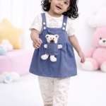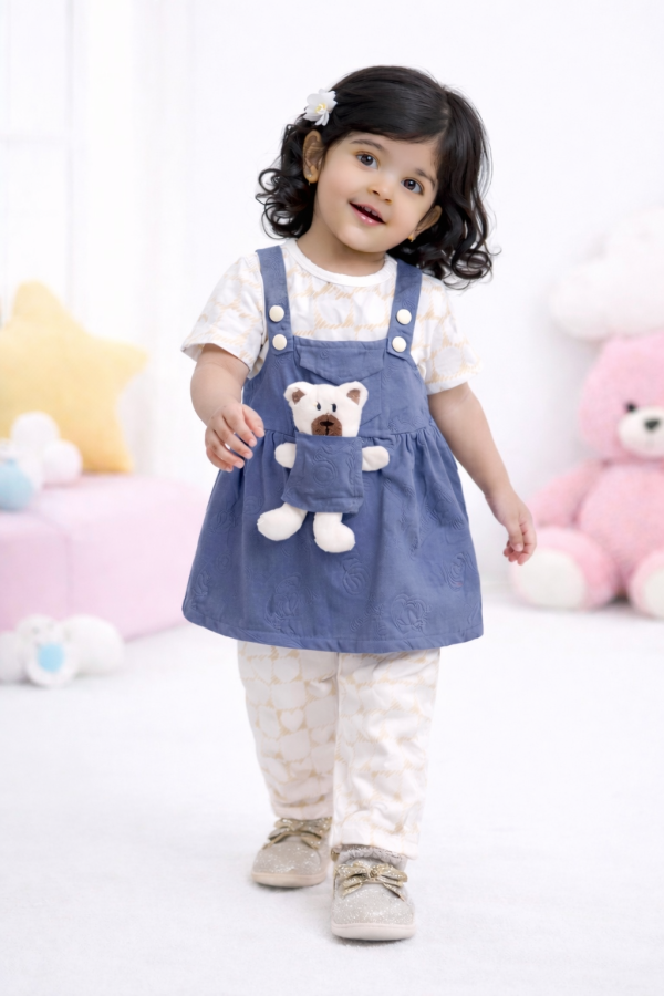 Cute and stylish girls 3 piece outfit featuring a printed inner shirt, matching trousers, and a pinafore dress with an attached bear toy pocket. Designed for a playful and comfortable look, perfect for casual wear and outings. Suitable for girls aged 1 to 4 years.